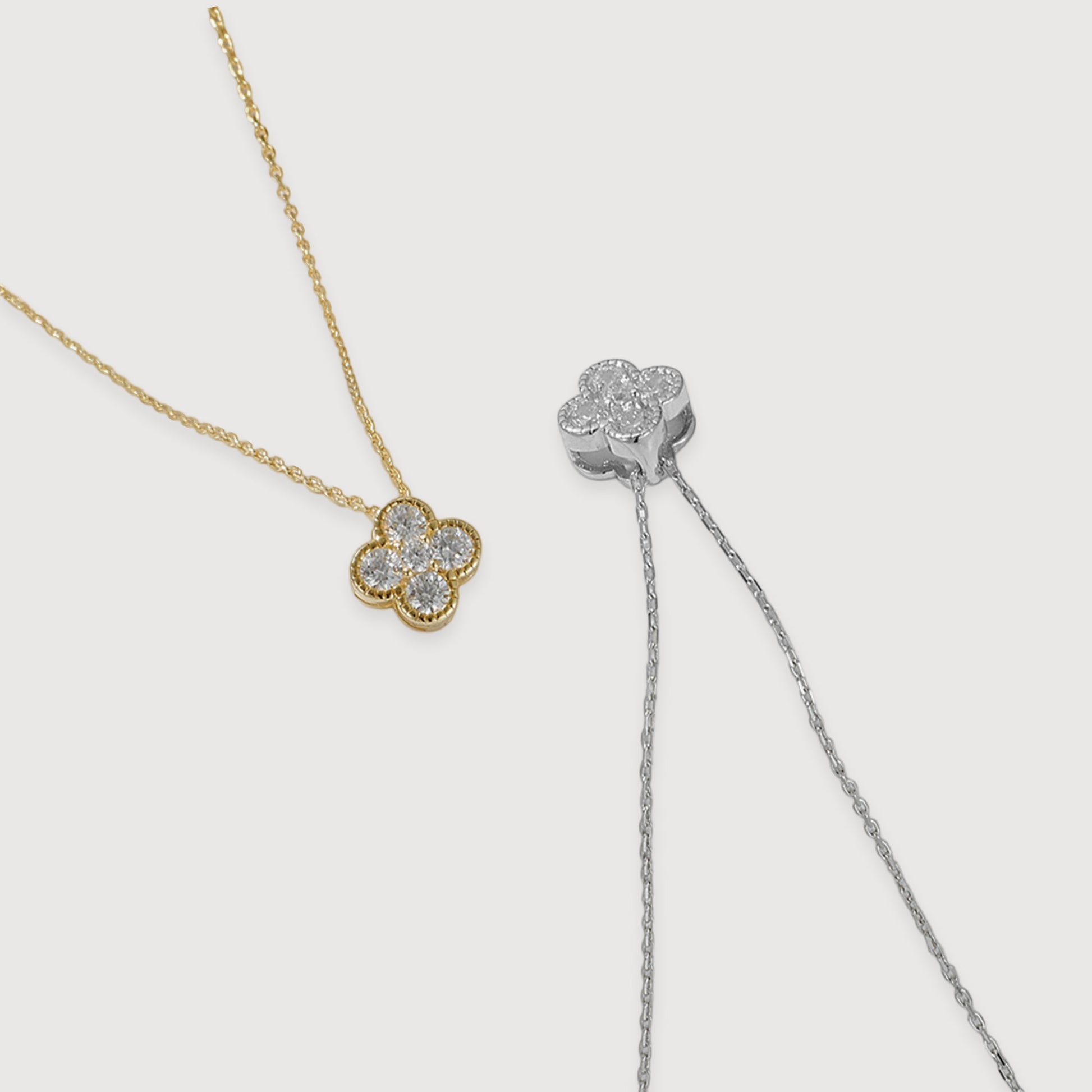 The Clover Shine Necklace features a delicate four-leaf clover pendant adorned with brilliant cubic zirconia — each petal symbolizing hope, love, faith, and luck. Crafted in 925 sterling silver, available in both rhodium-plated and 18K gold-plated finishes, it brings a soft, refined sparkle to any look.