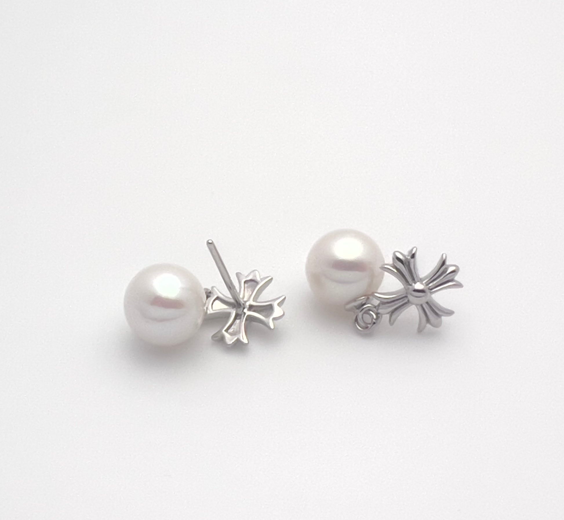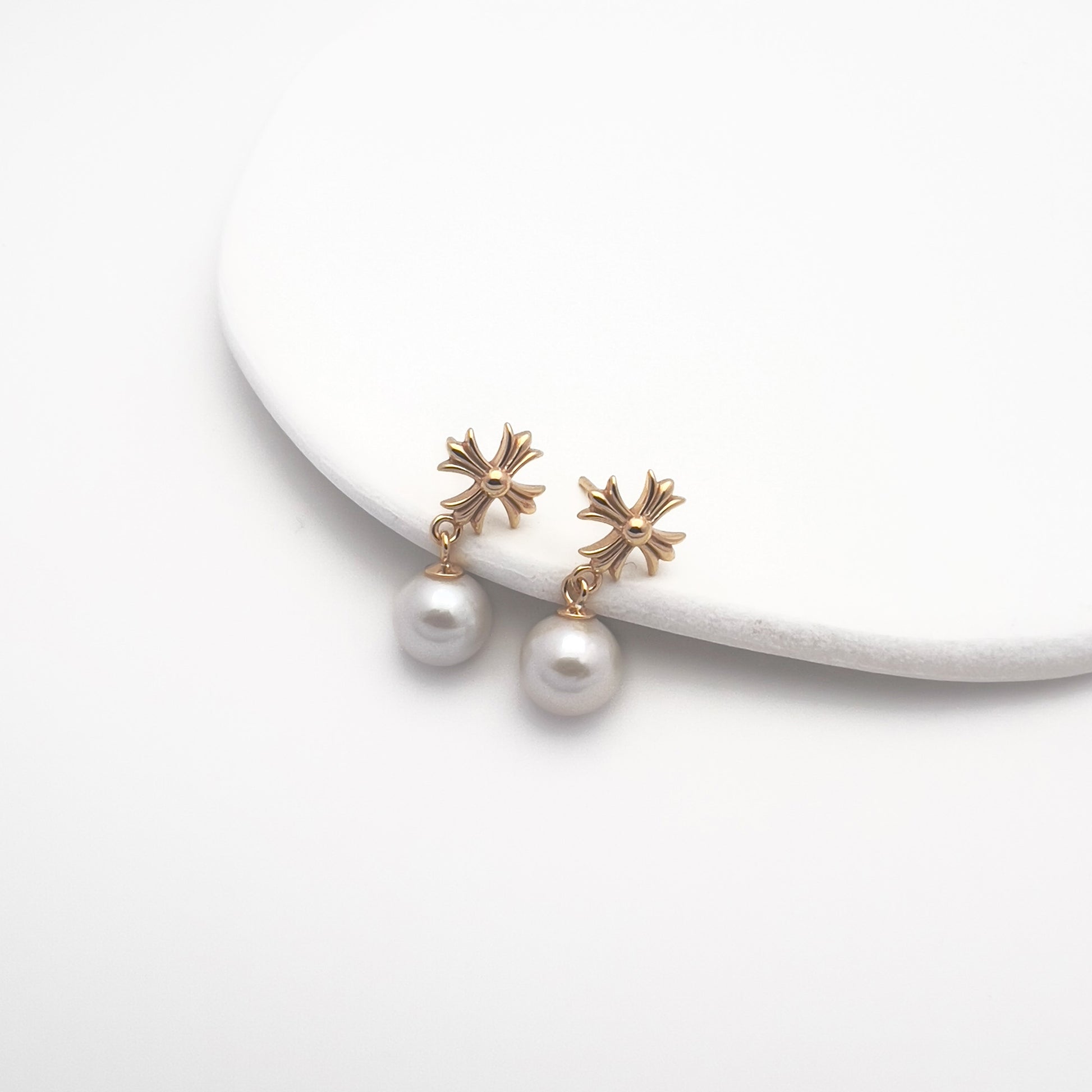 These earrings feature a sculpted cross motif paired with a luminous 7–8 mm pearl drop, creating a graceful silhouette that moves gently with you.